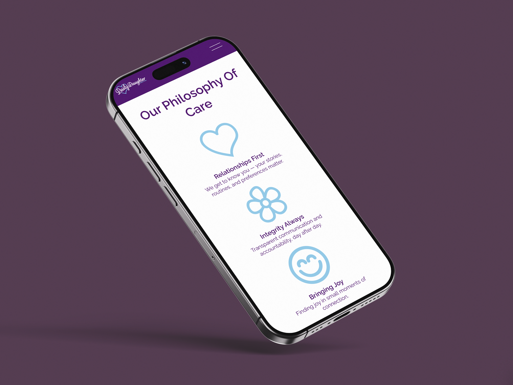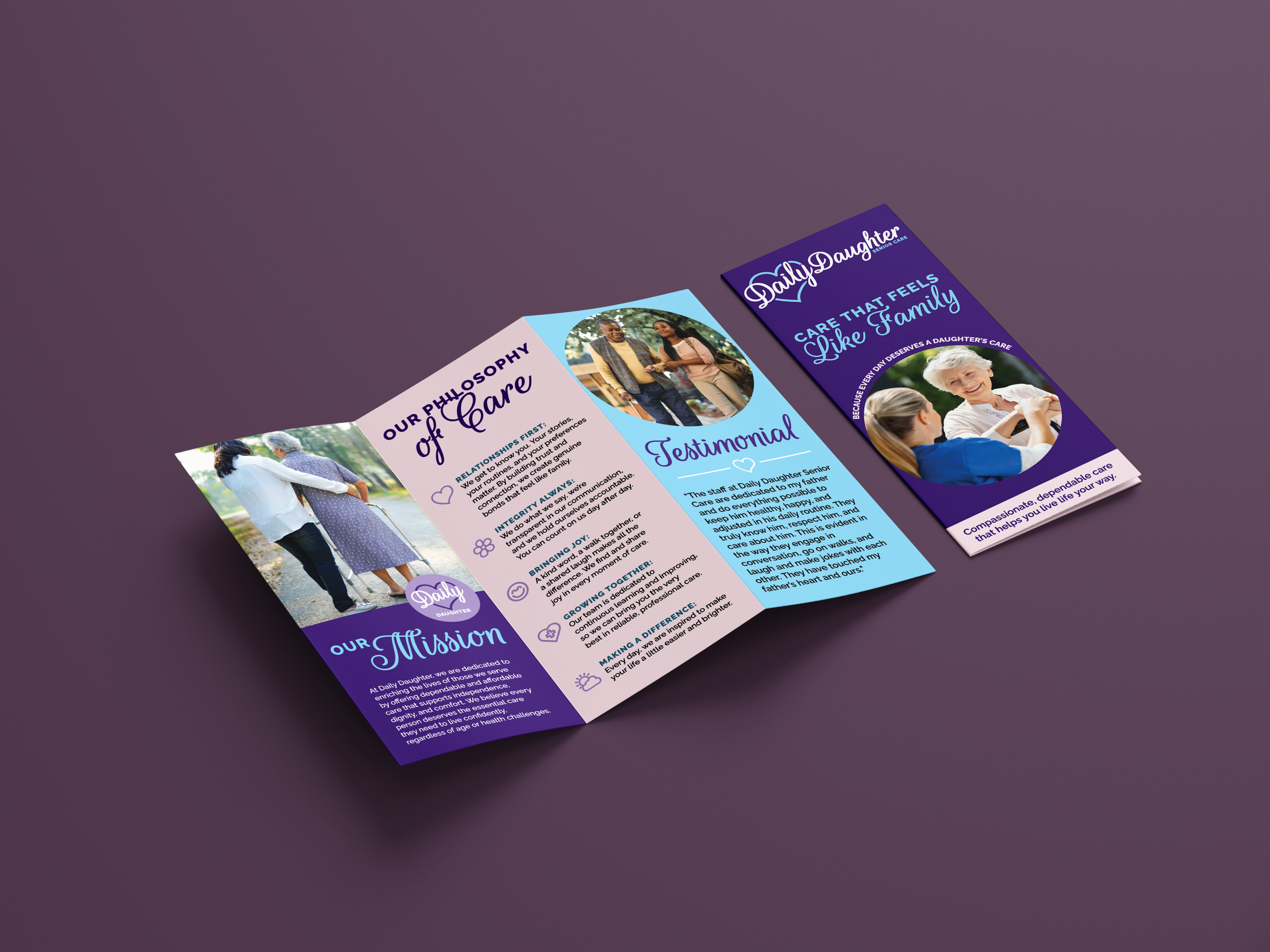 From there, we expanded the refreshed identity into key brand touchpoints, including a trifold brochure outlining Daily Daughter’s mission, values, and services. The project concluded with a streamlined website refresh, where I focused on retaining only the most essential pages to improve clarity, usability, and impact.